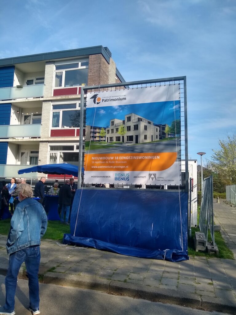 Bij de start van de nieuwbouw werd het bouwbord onthuld met daarop één van de drie nieuwe blokken met zes woningen. Het wordt nieuwbouw op een voor de stad hele ruime locatie, zo zei aannemer Benus uit Musselkanaal.